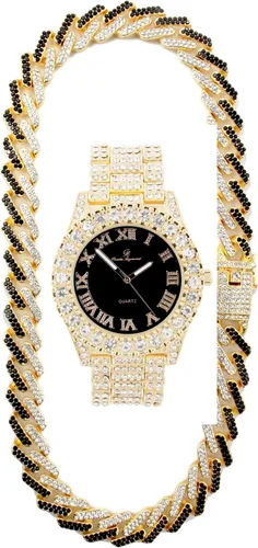 ¡Hielo en explosión! Bling'ed Out Rolly Looks with Ice on Watch Trim y correas de reloj con juegos de collar Zig Zag Bling'ed Out a juego – Juegos de collar ZZ (ST10327 RN oro/negro) Micro Pave CZ Zig Zag Bling'ed Out Black Panther Diamonds and Crystal Clear Ice Diamonds Hip Hop Collar de cadena de 18 pulgadas – Cierre en caja extra rico lleno de hielo de diamantes negros y transparentes con medallones laterales para mayor seguridad. El collar y el reloj combinan perfectamente tanto con diamantes transparentes como con diamantes de pantera negra. Cristales de hielo brillantes. Realmente convertido en una obra maestra, el reloj con tachuelas de cristal se personaliza al máximo. Caja redonda, con aspecto de diamante de cristal en el bisel y la correa del reloj. Los cristales en el reloj son diamantes de imitación. Cierre plegable con cierre de botones. La correa de reloj se puede hacer más pequeña por un joyero o un fabricante de relojes si es necesario. Piezas de movimiento de Japón: reloj de acero inoxidable, la satisfacción del cliente está garantizada. Viene con una caja de regalo. Tamaño del reloj de 9 pulgadas. Tamaño de la esfera: 1 pies 7 pulgadas. Ancho de la correa: 1 pulgada. Tamaño de las piedras: 1