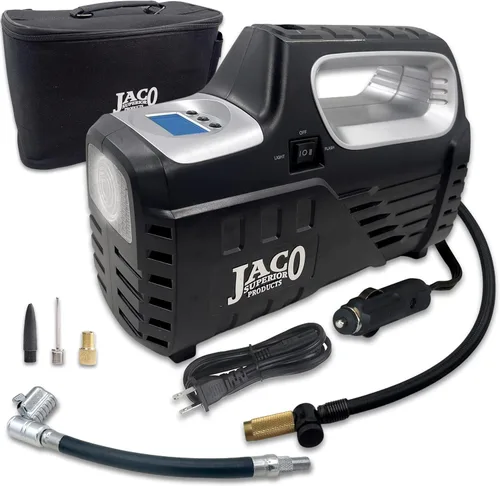 Este kit incluye el compresor de aire JACO SmartPro 2.0 AC/DC para inflador de neumáticos, estuche de almacenamiento, boquillas adaptadoras de inflado, adaptador Schrader-to-Presta para neumáticos de bicicleta y boquilla de extensión de manguera de bloqueo automático Lightning L2X patentada. El compresor de aire es capaz de funcionar con 12 voltios de CC y 120 voltios de corriente alterna.