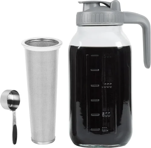 Fácil de preparar café helado: simplemente añade granos de café grueso al filtro con la cuchara incluida, llénalo con agua y luego déjalo reposar en el refrigerador durante 12 horas. Simplemente retira el filtro y tu delicioso café frío estará listo para disfrutar. Di adiós a la cafetería y ahorra dinero Tapa de boquilla para verter tarro de masón: es más robusta y resistente. El cómodo mango te permite levantar la jarra de café frío a todo el peso sin deformación ni rotura. La boquilla en forma de V no causa gotas ni salpicaduras y es fácil de abrir la tapa, apta para artritis. Lo hemos rediseñado pensando en la experiencia del usuario, haciéndolo más cómodo para ti Materiales seguros: nuestra jarra de café en frío está hecha de vidrio resistente de grado alimenticio que no contiene BPA, lo que garantiza que es una opción segura y duradera para almacenar bebidas. El diseño de boca ancha hace que la limpieza y el llenado sean muy fáciles Sello fuerte: el sistema de sellado de tarros de café preparado en frío aísla completamente tu bebida del aire y a prueba de fugas, evitando que los olores del refrigerador la afecten y garantiza que tu café helado se mantenga fresco y sabroso durante más tiempo Aplicación versátil: nuestra jarra de infusión fría viene con un filtro de acero inoxidable para evitar que los posos de café entren en la jarra, mejorando el sabor del café. Además, se puede utilizar para hacer té helado y otras bebidas. Puede quitar el filtro para almacenar otras bebidas. Ya sea que estés preparando café, té solar, bebidas frías o almacenando bebidas, es la elección perfecta. Además, su diseño compacto cabe fácilmente en la puerta del refrigerador