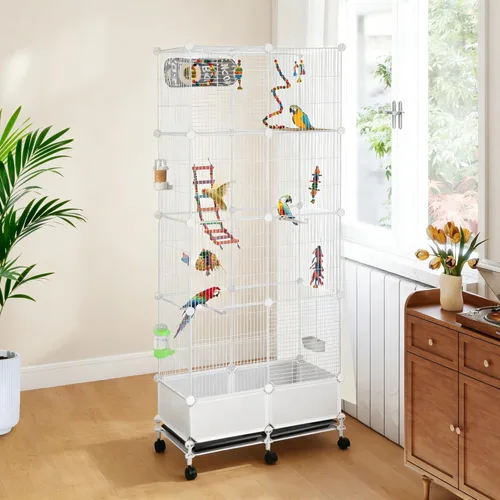 【Jaula para pájaros espaciosa extragrande】Mide 28 pulgadas de largo x 15 pulgadas de ancho x 69 pulgadas de alto, esta jaula alta proporciona una amplia sala de estar para aves de tamaño pequeño a mediano, reduciendo la sensación de confinamiento y fomentando el movimiento natural. Se incluyen lazos de refuerzo estructural mejorados adicionales para reforzar la estabilidad y mejorar la seguridad general. Kit completo de accesorios para jaula de pájaros: esta jaula para loros viene con suministros esenciales completos: tazas de alimentación, dispensador de agua, plataforma de perca, perchas de madera, nido de pájaros, escalera y un juego de juguetes de 10 piezas que incluye columpios y juguetes para masticar. Todo lo que tu mascota necesita está incluido para un hábitat divertido y cómodo. Protector de salpicaduras inferior: diseño antisalpicaduras integrado en la base que contiene eficazmente restos de alimentos, plumas y salpicaduras de agua, manteniendo tu suelo limpio y minimizando la frecuencia de limpieza diaria para un entorno doméstico más ordenado. Bandeja deslizante para una fácil limpieza: cuenta con una bandeja extraíble que te permite limpiar rápidamente los desechos y la basura sin molestar o estresar a tus pájaros, lo que hace que el mantenimiento diario sea simple y sin complicaciones. Ruedas móviles y configuración flexible: equipado con 6 ruedas de rodadura suave con hebillas de bloqueo para un fácil movimiento o estar de pie seguro. La jaula incluye 3 puertas de acceso con pestillos seguros y soporta un montaje flexible, lo que te permite personalizar el diseño para la comodidad de tus pájaros.