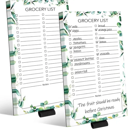 2 libros de 120 páginas: tenemos 2 paquetes de blocs magnéticos de lista de comestibles para nevera para usted, 60 páginas por bloc de notas, el tamaño del bloc de notas es de 4.5 "x 7.5" (Nota: bolígrafo no incluido. ). Papel adhesivo doble de alta calidad: este bloc de notas magnético está hecho de papel adhesivo doble de 2.82 oz/m², que es un papel de arte con una superficie lisa que hace que sea fácil de escribir sin preocuparse por el sangrado de tinta. Las partes superiores se pegan con adhesivo lateral, y cada hoja se puede quitar fácilmente. Con un borde de hoja verde estéticamente diseñado que es claro y realista, evita que las simples almohadillas magnéticas para la lista de comestibles para refrigerador sean mediocres. Almohadilla magnética completa: cada bloc de notas magnético para refrigerador está forrado con una lámina magnética completa de alta calidad en la parte posterior, el área de succión es más grande y no se cae fácilmente, y se puede adsorber fácilmente en cualquier mueble y electrodomésticos de metal liso como refrigerador, microondas, archivadores y así sucesivamente, y no se desliza ni se cae cuando estás tomando notas. Diseño flexible de soporte para bolígrafos: el soporte flexible para bolígrafos que diseñamos para una almohadilla magnética de lista de comestibles para nevera hace que ya no te preocupes por buscar un bolígrafo en todas partes. El soporte para bolígrafos tiene un tamaño para adaptarse a una amplia gama de bolígrafos de uso común, como bolígrafos estilográficos, lápices y bolígrafos, lo que te ayudará a realizar un seguimiento de notas y recordatorios importantes más rápido, y dejar de olvidarte de eventos significativos y vacaciones. Ampliamente utilizado: las almohadillas magnéticas perfectas para listas de comestibles para refrigerador son adecuadas para que las uses en listas de compras, listas de compras, recetas, listas de víctimas, recordatorios especiales, listas de tareas, horarios de vacaciones, etc. Es una excelente opción para ponerlo en tu dormitorio, cocina, oficina, escuela.