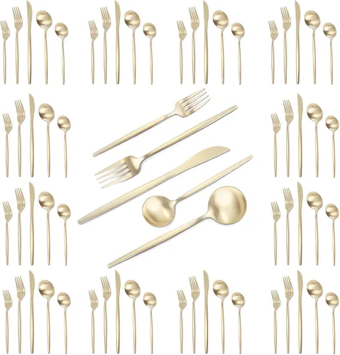 VANVRO Juego de cubiertos color dorado champán, juego de cubiertos de acero inoxidable de 60 piezas, juego de cubiertos mate para 12, cubiertos de