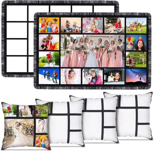 El paquete incluye: recibirás 2 mantas de sublimación con 15 paneles y borlas y 4 fundas de almohada de sublimación con 6 paneles, adecuadas para que crees tu propia decoración del hogar con tus fotos favoritas; Nota: la temperatura óptima de impresión es de 374.0 °F/374 grados Fahrenheit y el tiempo de impresión es de 45-60 segundos Información sobre el tamaño: la manta de sublimación es de aproximadamente 60 x 40 pulgadas con 15 paneles en blanco, la funda de almohada de sublimación es de aproximadamente 17.7 x 17.7 pulgadas con 6 paneles en blanco, suficiente espacio para que puedas imprimir tu propio diseño, logotipo o imagen en la tela, lo que resulta en un producto novedoso y significativo Material de calidad: las mantas de sublimación están hechas de material de franela de poliéster de calidad con mano de obra fina, no se decolora ni arruga fácilmente, suave, suave y cómoda al tacto, son lavables a mano y lavables a máquina, fáciles de limpiar y mantener Regalos prácticos para amigos: estas mantas de sublimación y fundas de almohada son un buen regalo para tus familiares, amigos, familiares, colegas, compañeros de clase y vecinos en Navidad, Halloween, día de Acción de Gracias, Año Nuevo, Día de la Madre, Día de San Valentín, aniversario, cumpleaños u otros días especiales, y estarán satisfechos después de recibir los regalos Amplia gama de usos: estas mantas de sublimación y fundas de almohada son adecuadas para una variedad de ocasiones, como cama, sofá, sala de estar, guardería, aula, oficina, accesorios ideales para siestas, dormir, viajar, jugar, acampar y leer