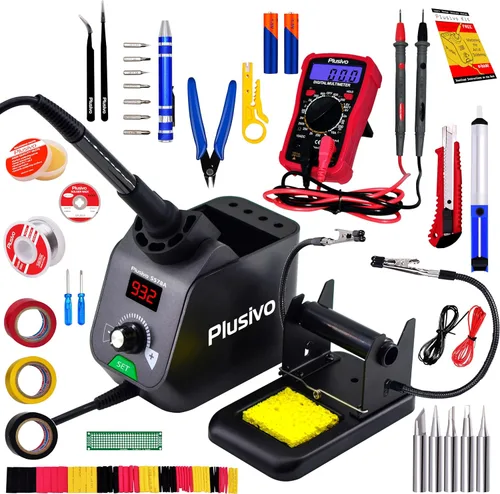 Alto rendimiento y temperatura ajustable: estación de soldadura digital confiable que se calienta rápidamente con un mando de control de temperatura fácil de usar hasta 932 °F (932.0 °F), proporciona una temperatura estable para manejar varios proyectos de soldadura Compacto y ahorra espacio: estación de soldadura fácil de usar con soporte integrado para soldador que se adapta perfectamente a cualquier banco de trabajo: el soporte, control de temperatura, soporte de puntas de soldadura, hierro de soldadura está todo en un solo lugar Funciones y características: pantalla digital con fácil conversión de °C/°F, bloqueo de temperatura, modo de espera y reposo, calibración de temperatura Juego completo: limpiador de puntas de soldadura, multímetro y sondas, alambre de soldadura, pasta de soldadura, bomba desoldadora/ventosa de soldadura, 5 puntas de soldadura, pinzas, cortador, cinta eléctrica, pelacables, mini destornilladores, mini PCB, tubos termorretráctiles Garantía de satisfacción: con garantía del fabricante de 30 días y apoyo al cliente de por vida; adecuado para proyectos de soldadura, trabajos de fijación de bricolaje en el hogar, electricidad, electrónica, reparaciones de electrodomésticos, soldadura de placas de circuito, otras aplicaciones de bricolaje