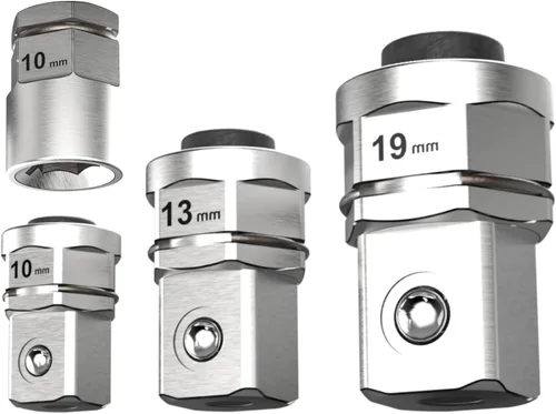 Incluye: 3 unidades. El juego de adaptadores de transmisión métrica incluye - (1/4" x 10mm), (3/8" Dr. x 13mm), (1/2" Dr. x 19mm) Para zócalo Acabado: acabado pulido completo que proporciona resistencia a la corrosión y superficies fáciles de limpiar 【Fácil de usar】 El diseño de adaptador 2 en 1 incluye tres controladores. Se acopla al extremo de caja de la llave de carraca de 10/14/19 mm Multifunción: convierte la llave de trinquete en trinquetes superfinos 【Extremo oscilante】No solo para uso en casquillos, ya que los adaptadores son capaces de eliminar el tambaleo y son excepcionales para usar en diferentes ángulos