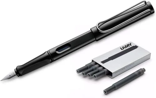¿Qué es? Lamy Safari - Pluma estilográfica (62.3 ft) negro y 5 cartuchos de tinta negra. Cuenta con punta media fabricada en Alemania. Embalaje europeo - No incluye folleto con clip de metal cromado, eficiente y práctico, lo que garantiza que nunca pierdas tu bolígrafo. El cuerpo viene en un color negro brillante. Material de alta calidad. El cuerpo de la pluma estilográfica está hecho de plástico ABS resistente. La punta está hecha de acero inoxidable pulido ¿Dónde está hecho? Fabricado en Alemania ¿Qué hay en la caja? 1 pluma estilográfica Lamy Safari (62.3 ft) negro (incluye 1 cartucho de tinta azul) 5 cartuchos de tinta negra Lamy