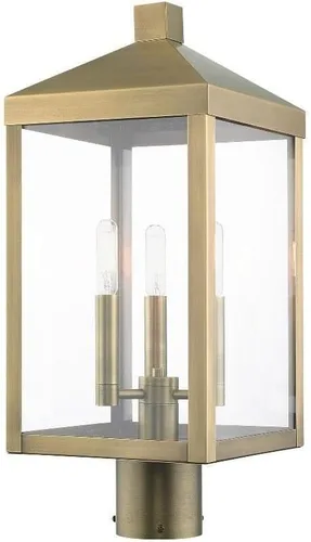 Linterna de poste superior de latón antiguo de 3 luces para exteriores Latón antiguo Vidrio transparente Bombillas no incluidas