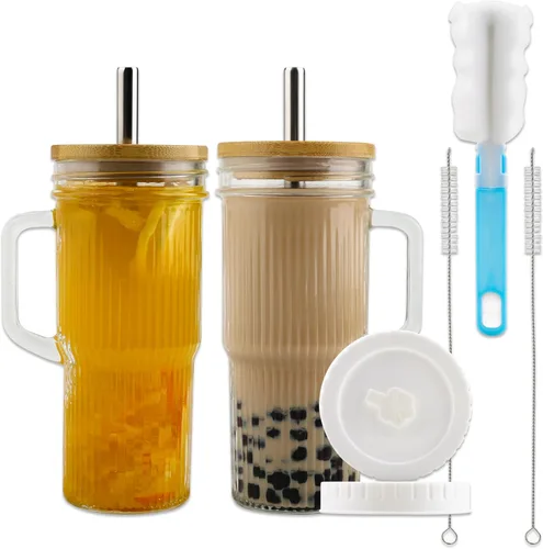 Vasos de vidrio acanalados con tapas y pajitas de bambú, vaso para café helado con asa, tarro Mason con tapa de 24 onzas, vasos de boca ancha, vaso