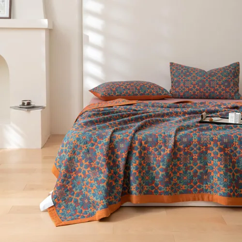 Manta de 100% Algodón Muslin Jacquard con Estampado Floral Bohemio Mandala, Manta Suave para Cama 3 Capas Reversible Cubrecama Transpirable y Ligera