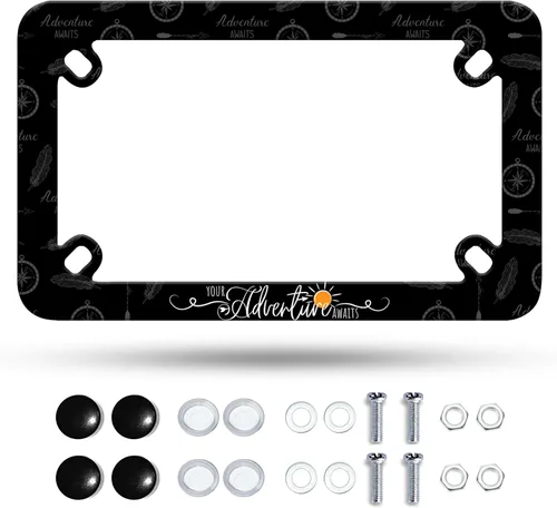 Marco de matrícula de motocicleta Adventure Awaits con brújula y plumas tribales, material de acero inoxidable, divertido soporte para placa de