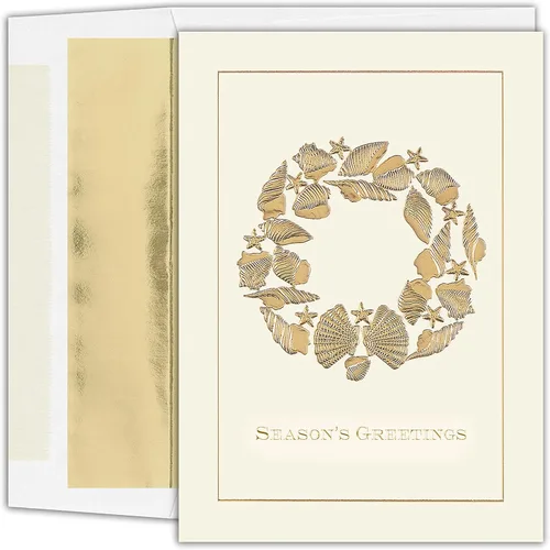 Caja con 16 tarjetas a juego y 16 sobres blancos forrados con papel dorado Las conchas marinas doradas en relieve y las palabras "Season's Greetings" decoran la parte delantera de esta tarjeta Mensaje impreso en el interior en tinta roja: Los pensamientos más cálidos y los mejores deseos para unas vacaciones maravillosas y un año nuevo muy feliz Impreso en papel de calidad, el tamaño de la tarjeta plegada es de 7.87 x 5.62 pulgadas Comparte tu amor por la playa cuando envíes una tarjeta navideña de Warmest Wishes a amigos, familiares y colegas