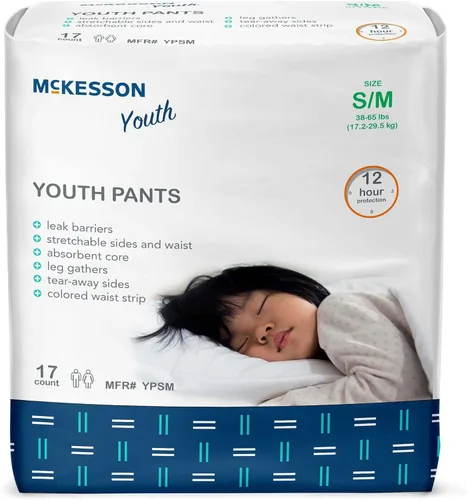 McKesson Youth Training Pants, [17 unidades], Pañales desechables pull-up para toda la noche, talla pequeña/mediana, 38-65 lbs, protección