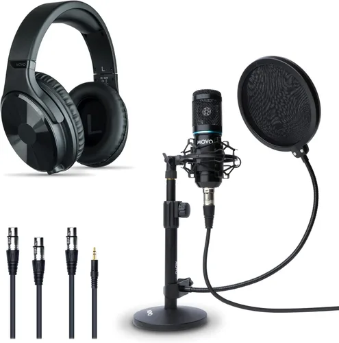 Movo Paquete de micrófono de estudio y equipo de podcast, micrófono de condensador XLR de 0.138 in y para cantar, auriculares de estudio con cable