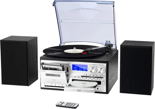【Reproductor de discos 10 en 1】Este reproductor de discos 9 en 1 combina un tocadiscos, radio AM/FM, reproductor de CD, reproductor de casetes, conectividad Bluetooth y reproducción USB/SD, ofreciéndote una amplia gama de opciones de escucha en una unidad compacta. Discos de vinilo de 3 velocidades: el tocadiscos soporta tres velocidades (33, 45 y 78 RPM), lo que te permite reproducir una amplia variedad de discos de vinilo y disfrutar de tus álbumes favoritos con facilidad. Múltiples opciones de reproducción: reproduce tus discos de vinilo, CD y casetes favoritos, o disfruta de archivos de música digital a través de USB y tarjeta SD. La función de radio AM/FM también te permite sintonizar tus emisoras preferidas. 【Bluetooth sin interrupciones】 Conecta fácilmente tu smartphone o tableta a través de Bluetooth para reproducir tu música favorita de forma inalámbrica. El control remoto incluido hace que sea conveniente administrar tu música a distancia. 【Audio mejorado con altavoces externos】Equipado con dos altavoces externos, este tocadiscos ofrece un sonido claro y equilibrado, permitiéndote disfrutar de tus discos de vinilo, CD y pistas digitales con un audio nítido.