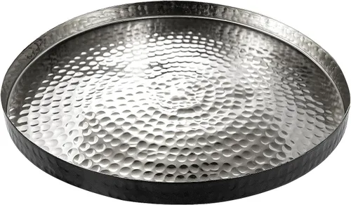 Bandeja decorativa redonda de aluminio martillado de 12 pulgadas en tono plateado deluxe con acentos negros en contraste para una estética moderna de art deco **Orgullosa hecha a mano en India** Cuenta con artesanía artesanal, hecha a mano de aluminio de alta calidad con una textura de guijarros, chapado en color plateado y un exterior negro mate La llamativa bandeja es perfecta para servir a los invitados deliciosos postres, deliciosos aperitivos o bebidas refrescantes mientras se entretiene en casa o en un lugar de eventos La base para centro de mesa añade un toque elegante a cualquier habitación, ideal para exhibir platos de dulces, posavasos y controles remotos en una mesa de café, velas y plantas en una consola, o productos de cuidado de la piel y cosméticos en una tocador o cómoda de dormitorio **Incluye almohadillas para el fondo** Dimensiones aproximadas: total - 1.0 H × 12.2 Diámetro (en pulgadas)