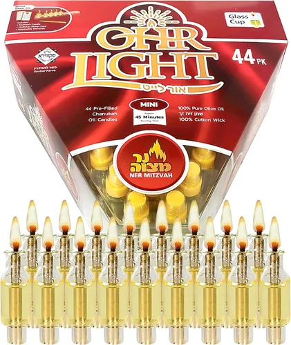 Fácil y limpio: preparar una menorá con vasos de aceite para encender velas puede ser complicado. Con las velas de aceite precargadas Ohr Lights, lo harás de una manera limpia y fácil. Simplemente retira la cubierta y estarás listo para encenderse. Basura cuando termine, no es necesario limpiar el vidrio. Tamaño y cantidad: nuestra caja de 44 unidades dura las 8 noches de Hanukkah, incluyendo el shamash. También incluye un shamash de cera de abejas y una tarjeta de bendición. Tamaño de la taza: 0.669 in (0.9 pulgadas) de ancho x 1.575 in (1.6 pulgadas) de alto. Tamaño de la clavija: 10mm (0.4"). Tiempo de combustión aprox. 45 minutos CALIDAD FABRICADA: Espere nada menos que lo mejor de Ner Mitzvah. Nuestras luces de aceite de chanuka se queman claras y brillantes sin derrames de aceite para mantener tu chanukiya limpio. Hecho de 100% aceite de oliva certificado kosher. REGALO CLÁSICO CHANUKA: No hay mejor manera de celebrar el festival de las luces que con una hermosa menorá. Esto hace que el regalo judaico perfecto. Bono incluido: kit de viaje incluido. Un pequeño soporte de plástico para menorá, para encender fácilmente las luces de aceite de la menorá sobre la marcha.