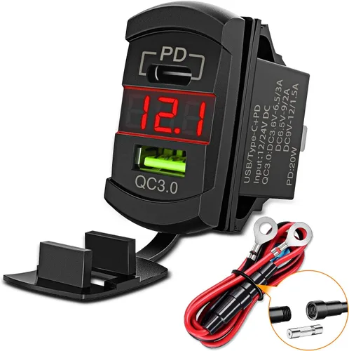 Carga eficiente: el enchufe de cargador Nilight está equipado con 2 puertos de carga, que combina un cargador tipo C y un puerto de cargador USB QC3.0. Proporciona una velocidad de carga 4 veces más rápida que el cargador USB de coche convencional. Capaz de cargar 2 dispositivos simultáneamente a alta velocidad. Satisface tu demanda de carga rápida en caso de falta de tiempo. Diseño de seguridad: El voltímetro está incorporado en el enchufe del cargador de coche que muestra y monitorea el voltaje de la batería o el sistema eléctrico de tu vehículo en tiempo real y previene los problemas causados por el bajo voltaje. El cable de alimentación también incorpora un fusible de 10 A para proteger el dispositivo contra sobrevoltaje, sobrecarga y cortocircuito. Doble protección para el proceso de carga. Tamaño estándar: El cargador USB estilo Rocker cabe en paneles de interruptores basculantes comunes, encaja perfectamente en ranuras donde se supone que deben ir los interruptores. Fue un reemplazo directo para el agujero rectangular adicional para un accesorio en el tablero. Ideal para barcos, vehículos todo terreno, yates, ATV, lanchas rápidas, caravanas, camiones y otros vehículos. Amplia compatibilidad: Se adapta a cualquier automóvil de 12-24 V DC, camiones, furgonetas, caravanas, cámperes, motocicletas, cuatrimotos, etc. Este enchufe USB es adecuado para cargar iPhone, iPad, tabletas Android, baterías externas, controladores de videojuegos, reloj deportivo, etc. dispositivos electrónicos con PD y equipos alimentados por USB. El paquete incluye: un cargador USB estilo interruptor basculante, un arnés de cableado.