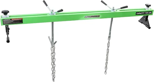 Soporte de motor casi universal: Bueno para reparaciones de motores y transmisiones en casi cualquier vehículo de pasajeros; Capacidad de sujeción: 1, 100 libras. / 1,102.3 lbs. Reparaciones de motor o transmisión: Posiciona y sostiene con precisión el motor mientras se trabaja en la transmisión, o mantiene la transmisión en su lugar mientras se retira el motor para su reconstrucción Soporte de motor ajustable: Los ganchos de cadena roscada y la posición de los pies de soporte se ajustan para adaptarse a todos los automóviles Seguro para uso a largo plazo: La construcción de doble barra de acero significa que esta barra de motor puede soportar su motor o transmisión durante reconstrucciones prolongadas Especificaciones del producto: (1) 1100 libras. Barra de soporte del motor; Dimensiones: 59.25" x 9.75"; Dos cadenas de 38"; Capacidad: 1100 libras. ; Los ganchos se pueden ajustar de 28-3/4 pulgadas a 58-1/4 pulgadas de ancho; 3 canales para ajustar para aplicaciones universales; patas de goma antideslizantes; peso: 38.1 libras.