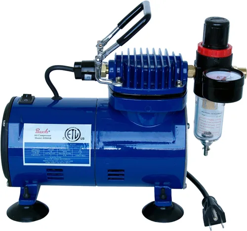 Compresor de pistón de 1/5 HP con regulador y trampa de humedad Ofrece 1-35 PSI dependiendo del aerógrafo que se esté utilizando Paassche 1/4 "NPT accesorio de manguera con adaptador 1/8 BPS Función de apagado automático Se adapta a Paasche 1/4 "NPT y tiene adaptador BPS de 1/8 para mangueras de la competencia