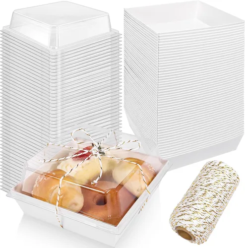 Paquete de 50 cajas de papel para embutidos con tapas transparentes, recipientes cuadrados blancos para galletas de 4.3 pulgadas, cajas de postre de
