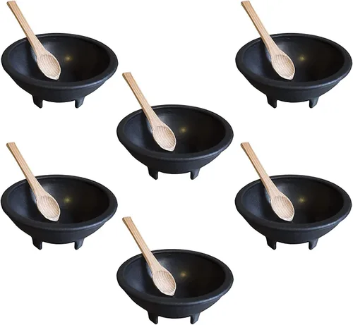 Paquete de 6 cuencos de salsa de plástico negro con cuchara de madera. Perfecto para cualquier comida o fiesta mexicana. Materiales resistentes y duraderos que durarán para siempre y son fáciles de limpiar.
