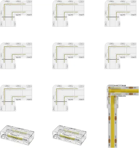 【Luces compatibles】Este juego de accesorios de instalación solo es compatible con tiras de luces LED COB de 2 pines de 8 mm de ancho (no aplicable a tiras de 10 mm de ancho y tiras de luces LED COB con CCT ajustable). El conector transparente de tira a cable te permite conectar fácilmente una tira COB a otra tira COB con cable sin soldar Versión mejorada: a diferencia de los conectores de esquina anteriores, la nueva versión del conector en forma de L no tiene huecos. Las dos tiras de luz estarán muy cerca una de la otra para formar un haz de luz cuando uses este conector. Y el diseño más delgado hace que sea más fácil colocarlo en el canal Conectores sin soldadura y sin huecos: utilizando este kit de conectores de tira LED COB puedes extender la longitud de tu tira de luz para que sea más larga, eliminando el problema de espacio limitado. Estos accesorios te permiten extender y conectar tiras de luz, los conectores rectos (en forma de L) en el kit te permiten lograr una conexión de esquina 【Fácil de usar】Kit de conector COB con 8 conectores transparentes en forma de L/esquina sin espacios y 2 conectores transparentes sin espacios, fácil de instalar y no necesita soldadura. Este kit de conectores COB te permite hacerlo tú mismo para un trabajo seguro y fácil que te ahorrará tiempo y dinero. La ventaja del paquete actualizado es que se puede restablecer repetidamente y la instalación es más conveniente 【Conexión estable】Conexión estable para un uso diario duradero. NOTA IMPORTANTE: Antes de presionar la conexión, verifique si los polos positivo y negativo de la tira de luces son consistentes con el otro extremo