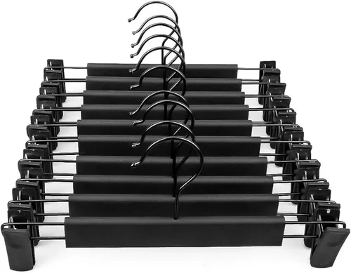 Multifuncional: las perchas de plástico de 12 x 5.3 pulgadas no solo pueden acomodar faldas y pantalones de cualquier tamaño, sino que también son adecuados para colgar en otras prendas, como chaquetas de camiseta. Toda tu ropa se puede fijar firmemente para proteger tu ropa de arrugas y daños Gancho giratorio y dos clips ajustables: gancho giratorio multiusos con dos clips de metal ajustables para adaptarse a cualquier tamaño de falda o pantalón; gancho giratorio de 360° para una fácil gestión Diseño antideslizante: el cuerpo de las perchas está diseñado con una superficie mate. El gancho está hecho de acero inoxidable. Está recubierto con una pintura de goma negra ecológica. El clip puede soportar 20 libras de peso y el clip interior tiene un diseño antideslizante, chaflán de arco, sin bordes afilados Rango aplicable: los ganchos de plástico son ideales para uso doméstico en armarios de pañuelos y también para empresas de tiendas de ropa, para niños, adultos y bebés para armario. El tamaño de las perchas para ropa y pantalones es flexible para todos los grupos de edad Larga duración: protege tus pantalones y ropa de arañazos y arrugas. Diseñado con plástico duradero hecho para garantizar la durabilidad