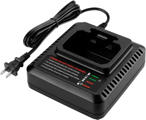 Descripciones del producto: Enchufe estándar de EE. UU., entrada 100-240V, Reemplazo para Black and decker 40v Max cargador rápido LCS36 LCS40. Carga rápida: carga baterías BLACK+DECKER 36v o 40v Max en menos de 2 horas. El cargador de batería de repuesto Black&Decker 40v funciona bien como el original. (Cargadores LBX36 en 1 hora, LBXR36 en 1.5 horas y LBXR2036 en 2 horas o menos. Amplia compatibilidad: compatible con todas las herramientas de litio Black & Decker de 36 V o 40 V Max, para Black and Decker batería de litio de 36/40 voltios LBX2040 LBXR36 LBX36 LBXR2036 LBX2540 LST540 LCS1240 LBX1540 LST136W. Luces indicadoras del cargador: Carga: la luz verde parpadea, completamente cargada: la luz verde permanece encendida, defectuoso: la luz roja parpadea rápidamente, sobretemperatura: la luz roja parpadea lenta y rápidamente. La seguridad del producto está garantizada: los productos tienen certificación CE, FCC, ROHS, probados por el fabricante para que coincidan con las especificaciones de los productos OEM. 12 meses de garantía proporcionada.