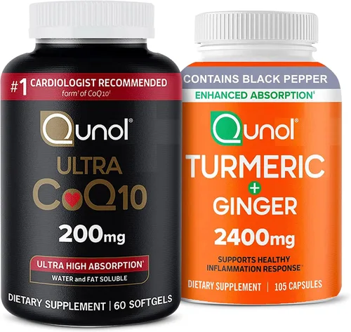 Ultra alta absorción: los ensayos clínicos han demostrado que ningún otro suplemento de CoQ10 absorbe mejor que Qunol. La fórmula patentada de Qunol CoQ10 es 100% soluble en agua y grasa, a diferencia de la CoQ10 regular que no se disuelve en agua y se disuelve muy mal en grasa FÓRMULA DE ABSORCIÓN MEJORADA: Las cápsulas de cúrcuma Qunol contienen 2250 mg de curcuminoides al 95%, 150 mg de polvo de raíz de jengibre orgánico y 15 mg de extracto de pimienta negra para mejorar la absorción. Otras formulaciones pueden tener solo 5% de curcuminoides. Forma de CoQ10 #1 recomendada por cardiólogos - Con una absorción superior en comparación con la CoQ10 regular, las cápsulas de gel suave Qunol 200 mg de CoQ10 pueden ayudarte a alcanzar niveles óptimos de coenzima Q10 con mayor rapidez, para que puedas experimentar los beneficios potenciales más rápido. Extracto de pimienta negra: las cápsulas Qunol de cúrcuma más jengibre de 2400 mg contienen extracto de pimienta negra que mejora la absorción y aumenta la biodisponibilidad Beneficioso para usuarios de medicamentos con estatinas - Se ha demostrado que los medicamentos con estatinas reducen los niveles de CoQ10 y la adición de un suplemento de CoQ10 a la terapia con medicamentos con estatinas puede ayudar a reponer el CoQ10 perdido CURCUMINA DE CÚRCUMA: Tiene una larga tradición de ayudar a calmar las articulaciones cansadas y sobretrabajadas. Apoya la respuesta inflamatoria saludable asociada con el sobreesfuerzo físico Esencial para la producción de energía - CoQ10 juega un papel vital en la producción de energía en el cuerpo. Tomar un suplemento de CoQ10 ayuda a aumentar los niveles naturales de CoQ10 que pueden agotarse con la edad y los medicamentos con estatinas que reducen el colesterol Raíz de jengibre: una hierba tradicional utilizada durante siglos repleta de botánicos relajantes Satisfacción garantizada: estamos orgullosos de nuestros productos; si no estás 100% satisfecho con tu producto, Qunol te reembolsará completamente tu compra al 1-877-290-2621 Apoya la respuesta saludable a la inflamación y la salud de las articulaciones: Muévete. Qunol Cúrcuma apoya la respuesta inflamatoria saludable asociada con el sobreesfuerzo físico y también puede ayudar a promover la comodidad de las articulaciones. APOYA LA RESPUESTA INFLAMATORIA SALUDABLE Y LA SALUD DE LAS ARTICULACIONES: Ponte en movimiento. Qunol La cúrcuma apoya la respuesta inflamatoria saludable asociada con el sobreesfuerzo físico y también puede ayudar a promover la comodidad de las articulaciones