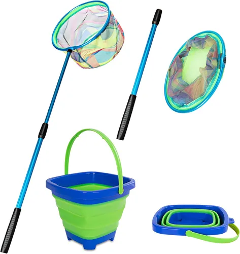Red de pesca para niños, red de aterrizaje telescópica con mango de poste de aluminio, cubo de arena plegable, red de mariposa para jugar al aire