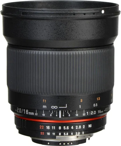 Lente ultra gran angular de 16mm Longitud focal: 16 mm, Distancia mínima de enfoque: 7.9 pulgadas (0.2 m) Gran abertura f/2.0 para fotografía con poca luz y disparo nocturno en la calle Diseñado para cámaras con sensores de imagen APS-C recortados, incluye capucha de lente extraíble y acepta filtros de 77mm Disponible para Canon EOS, Nikon, Sony Alpha, Pentax, Micro 4/3, Sony E-Mount, Canon M, Fuji X y Samsung NX. Construcción óptica: 13 vidrios