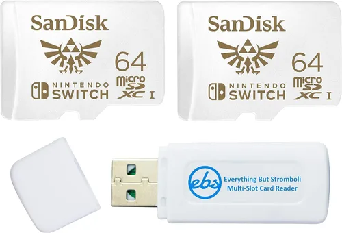 El paquete incluye (2) SanDisk MicroSDXC de 64 GB para tarjetas de memoria Nintendo Switch con embalaje temático Zelda y (1) lector de tarjetas SD Everything But Stromboli Multi Slot. Incluye ranuras SD, Micro SD (ranura para tarjeta TF), M2 y MS para facilitar la transferencia y visualización de archivos en la computadora Esta tarjeta Micro SD temática de Zelda cuenta con almacenamiento de juegos compatible con el modelo OLED de Nintendo Switch, el modelo OLED Scarlet y Violet de Nintendo Switch, Nintendo Switch y también funciona con Nintendo Switch Lite. Añade más memoria para más juegos digitales, incluyendo tus títulos favoritos de Zelda y Mario Kart (64G es almacenamiento total de la tarjeta, se requiere cierto espacio para el mantenimiento, por lo que el almacenamiento real del usuario puede ser menor) Alta velocidad de hasta 100 mb/s Velocidades de lectura; Velocidad de escritura de 60 mb/s; UHS-I, U3, Clase de velocidad 10 para grabación y reproducción de video Full HD y 4K con dispositivos compatibles La tarjeta SanDisk MicroSD para Switch es un accesorio esencial y oficial de Nintendo y cuenta con clasificaciones de velocidad de clase 10 para cargar tus juegos, capturar capturas de pantalla o jugar con amigos y familiares SanDisk MicroSDXC para Switch son a prueba de golpes, a prueba de temperatura, impermeables y a prueba de rayos X y vienen en un embalaje minorista con una tarjeta de memoria Zelda temática en una funda de plástico reutilizable para tarjetas Micro SD Tarjeta SD perfecta para Lágrimas del Reino y Aliento de lo Salvaje (Zelda) para que puedas ampliar la capacidad de memoria de tu Switch