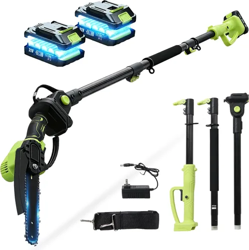 Motosierra inalámbrica 2 en 1 y sierra de poste Las barras guía de 6 y 8 pulgadas se pueden utilizar como una mini motosierra de mano o montarse en el poste de extensión telescópico para transformarse en una sierra de poste inalámbrica. Una motosierra eléctrica ligera maneja la poda de árboles, la poda de ramas, el corte de leña y el mantenimiento general del patio, ahorrando espacio y esfuerzo. Sierra de poste ajustable alimentada por baterías: alcanza hasta 14 pies. El diseño de poste ajustable te permite configurar la longitud de hasta 14 pies, para que puedas recortar ramas altas de forma segura mientras estás de pie en el suelo. Ideal para patios, huertos, granjas y mantenimiento de árboles residenciales, no se requiere escalera para un corte superior más seguro. 2 baterías recargables de 1500 mAh: tiempo de funcionamiento confiable incluye dos baterías recargables de 1500 mAh, que proporcionan hasta 40 minutos de tiempo de funcionamiento continuo bajo uso normal. Diseñado para poda al aire libre, campamento y trabajo diario en el patio, reduciendo el tiempo de inactividad y la necesidad de recargas frecuentes. Cabezal de corte ajustable de 180°: corte desde cualquier ángulo. El cabezal de corte se ajusta libremente de 0° a 180°, por lo que es fácil manejar ramas superiores, cortes laterales y ángulos difíciles de alcanzar. Logra cortes más limpios y precisos sin escaleras ni posiciones incómodas del cuerpo. Motor sin escobillas de alta eficiencia: corta hasta 8 pulgadas alimentado por un motor sin escobillas de alta eficiencia, esta motosierra inalámbrica ofrece un rendimiento de corte fuerte y estable. Maneja fácilmente ramas de hasta 8 pulgadas de diámetro, ya sea que se utilice como una motosierra de mano o una sierra de poste, perfecto para podas de alta resistencia, limpieza de tormentas, corte de leña y proyectos de patio de bricolaje. Ligero, bien equilibrado y telescópico: menos fatiga sobrecarga diseñado con un cuerpo ligero y bien equilibrado, mango antivibración y poste de extensión telescópico ajustable para un corte más seguro y sin escaleras. El poste se puede fijar de forma segura con una correa de soporte, lo que permite que la sierra se use sobre el hombro o en todo el cuerpo para ayudar a distribuir el peso durante el uso prolongado. Esto reduce la fatiga de brazos y hombros, mejora el control y la estabilidad, y hace que la poda superior sea más cómoda y segura, incluso durante sesiones de corte más largas. Kit completo con soporte de garantía Este kit de motosierra de poste incluye todo lo que necesitas para comenzar: unidad de motosierra ×1, 1 poste de extensión ajustable, 1 barra guía de 6 pulgadas (preinstalada), 1 barra guía de 8 pulgadas (con cubierta protectora), 2 baterías de 1500 mAh, 1 cargador, 1 manual de instrucciones (idioma español no garantizado), 1 botella de aceite, 1 correa para el hombro, 1 destornillador y juego de llaves. Respaldado por soporte de garantía para mayor confianza y uso a largo plazo.