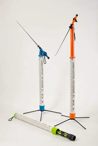 Conoce tu nueva configuración favorita de pesca en hielo: es compacto, construido para durar, y fácil de usar e incluso asequible. ! El innovador consejo es un sistema de pesca en hielo de tres partes que es compacto cuando se almacena y fácil de usar cuando se configura. Cada innovador Tip-Down viene con las siguientes partes: El tubo de almacenamiento, que sostiene la varilla y la base. La varilla, que mide 20 pulgadas de largo. Es rígido, pero aún se dobla para un enganche superior. La base, que soporta el Tip-Down, aprovecha la varilla y se atornilla en el tubo de almacenamiento. El tubo de almacenamiento es de plástico duro. Tiene un soporte de varilla extensible que se puede ajustar tan alto como 36" o tan bajo como 24". El soporte extensible tiene un cordón para sacar fácilmente el soporte del tubo y para un fácil manejo al mover la configuración. Se desliza hacia arriba y hacia abajo fácilmente, pero nunca se desliza. El pasador de pivote de la varilla se encuentra en las muescas superiores del soporte. La varilla mide 20 pulgadas y tiene guías de línea que incluyen una guía de línea especial justo encima del carrete para evitar enredos de carretes. El carrete tiene un mango plegable para enrollar fácilmente tu línea y señuelo. Cada carrete puede manejar más de 100 pies de línea. Cuando un pez golpea, la caña baja y permanece abajo mientras el pez esté encendido. Si el pez se suelta, la caña volverá a subir. Si la caña se inclina hacia abajo a su posición máxima, el pez puede sacar la línea libremente. La base dispone de cuatro patas giratorias que soportan la punta hacia abajo en el hielo. Doblar las patas crea un arnés para la varilla. La varilla se desliza entre las patas y las patas se pliegan en un "bloqueo de varilla" de 4 muescas que rodea el poste. El bloqueo de la varilla también tiene un lugar para colocar el gancho. Una vez que cada pata está doblada en el bloqueo de la barra, la base se desliza hacia el tubo de almacenamiento y luego se atornilla firmemente.
