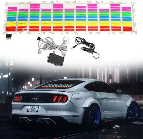 Es una hoja delgada con cinta adhesiva que se puede pegar en el parabrisas trasero o ventana lateral. Equipado con un cargador de automóvil que se puede insertar directamente en el automóvil para hacer que la lámpara luzca. Cinta adhesiva 3M en la parte posterior, muy fácil de instalar. El grosor de la hoja ahorra mucho espacio. Calcomanías de automóvil activadas por sonido, bailan inteligentemente con la música. Fácil de usar, simplemente conéctalo a 12 V CC y producirá un hermoso efecto. Bajo consumo de energía, solo 1 mW por centímetros de repuesto. Diseñado para decorar tu automóvil, te ofrece un espectáculo de iluminación fresco y hermoso. La sensibilidad del sonido es ajustable por una perilla según lo necesites. Mejora tu seguridad de conducción y hace que tu automóvil esté más moderno y sorprendente. Adhesivo de luces LED coloridas activadas por sonido. Las coloridas luces LED parpadearán como el ritmo de la música, te darán un ambiente romántico y moderno