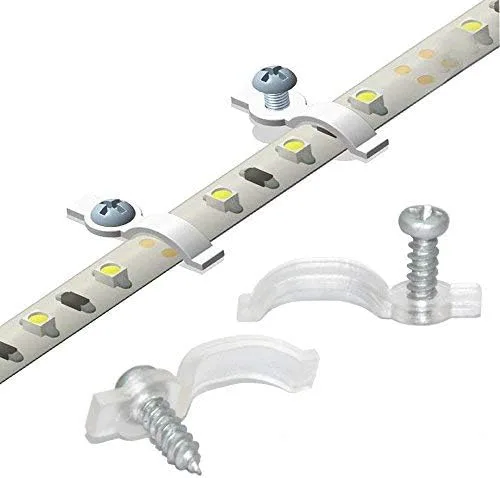 Este paquete de clips son con color transparente.La clara los clips se oculta a la vista.Además el color, tiene ventajas como siguiente: Tiras de LED de forma segura y reafirmante con clavo de uno para cada clip de montaje – Fácil instalación y mantenimiento.Y el lado no fijada es conveniente para tomar abajo la tira de luz LED libremente cuando reemplazar o mantener it. – Diseño ultradelgado el diseño ultra delgado puede sostener la tira de luz completamente y no tiene daños en brillo. – Fijación gruesa para 10 mm Impermeable tira de luz el soporte tiene el derecho de distancia de hollow y hollow Altura. Es ideal para el montaje de la tira de luz 3528/5050/5630/3014 SMD LED Impermeable de 10 mm de ancho.Derecho Tamaño hace instalación reducidos. – más alto grado material de nylon.El material de nailon con UL94 V-0 índice es de alta resistencia a la temperatura, tiene -4 °F-104 °F amplio rango de temperatura de trabajo que seguro y seguro para mantener la tira de luz. Detalles específicos: Distancia de agujeros: 11.15 mm Hollow Altura: 4 mm Temp de trabajo: -4 °F-104 °F Índice de retardante de llama: UL94 V-0. Contenido del paquete: Tira de Luz -100pcs soportes de montaje -105pcs tornillos