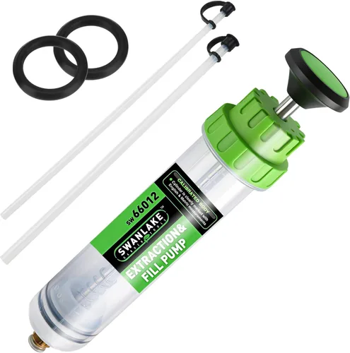 La bomba de llenado/extracción está diseñada para quitar y llenar líquido de frenos, anticongelante, aceite de engranajes, líquido de dirección asistida y mucho más. La bomba incluye dos extensiones de manguera de 7 x 1/4 pulgadas (diámetro exterior) para aplicaciones de alcance profundo y diámetro pequeño, tapa de bloqueo en el extremo de la manguera y una manguera transparente de 7.5 pulgadas/19 centímetros. La manguera se conecta al conector rápido del cilindro. Sellos dobles para líquido de frenos y anticongelante, ensamblados en el émbolo. Construcción resistente que permite fuerza y durabilidad. Capacidad: 200ML/0.21QT/7OZ.