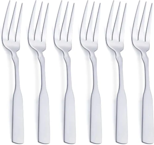Si estás buscando el tenedor de cena de alta calidad y distintivo, eso es todo. La superficie con acabado espejo de la cabeza, la superficie con acabado satinado del mango y la forma de 3 puntas te impresionarán a ti y a los miembros de tu familia. Hechos de acero inoxidable 18/0 extrafino, estos tenedores de cubiertos se pueden lavar en lavavajillas sin ningún problema. Los materiales resistentes hacen que las horquillas sean resistentes a la corrosión y durarán por años. Este tenedor de acero inoxidable mide 7.6 pulgadas de largo y 1.7 onzas de peso. Diseño resistente y ergonómico, se siente muy cómodo en tu mano. El tenedor de 3 puntas te permite pinchar y recoger tus alimentos fácilmente. Los 6 tenedores metálicos no solo son adecuados para el uso diario, sino también para fiestas, festivales y eventos formales, como bodas, celebraciones, banquetes, etc. Combinación perfecta de excelente calidad y diseño, este juego de tenedores de cubiertos se convertirá en una gran adición a tu colección de cubiertos.