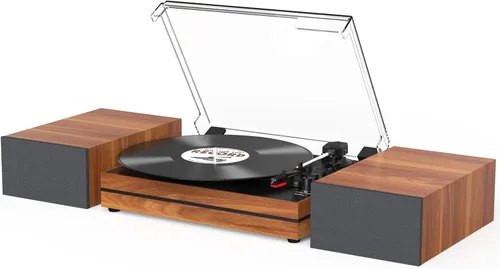 Dos altavoces externos duales: equipado con un par de altavoces separables, te permiten disfrutar del audio de vinilo completo, real y en vivo en altavoces duales fácilmente. Permite la conexión al conjunto de altavoces incluidos o a tus propios altavoces alimentados externamente a través de los cables de salida RCA duales. El volumen es lo suficientemente alto para muchas ocasiones. Será un sistema de música brillante para tu jardín, tu sala de estar y tu fiesta Transmisión de entrada inalámbrica de música: reproductor de grabación con receptor Bluetooth integrado que puede conectarse a tu teléfono celular inalámbrico a través de un emparejamiento Bluetooth sensible y rápido y reproducir música desde todos tus dispositivos favoritos. Ofrece una calidad de audio premium y te permite disfrutar de cada detalle sonoro de tu música favorita Diseño de aspecto vintage: disfruta de tu vinilo favorito con este tocadiscos de aspecto vintage. El diseño minimalista y retro de este tocadiscos lo convierte en un tocadiscos impresionante y funcional. Los altavoces de estantería de doble alimentación permiten múltiples opciones de colocación, y se pueden colocar como una estantería o estante de registros. Notarás nuestra atención al detalle a través de toques únicos que los modelos más asequibles no pueden igualar Giratorio de 3 velocidades accionado por cinta: el reproductor de discos de tres velocidades reproduce todos tus discos de vinilo de 33⅓, 45, 78 RPM (vinilos de 7, 10 y 12 pulgadas), adaptador de 45 RPM incluido. La función de parada automática permite detenerse automáticamente cuando llega al final del registro, protege mejor tus registros Compra sin preocupaciones por el usuario: configuración y operación sencillas. Ideal para un principiante. El puerto de entrada AUX le permite reproducir música mp3. La cubierta antipolvo desmontable con bisagras protege tu disco cuando no esté en uso, y no afectará la reproducción cuando lo cierres. Un aspecto vintage de alta gama, será un regalo perfecto para cumpleaños y Navidad, especialmente para un amante de la música. Cualquier pregunta, por favor envíenos un correo electrónico, siempre estamos aquí!