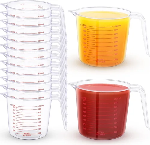 Experiencia de uso conveniente: estas tazas medidoras de plástico grueso y resistente son ideales para mezclar, medir y verter pinturas, resinas, materiales de arte y manualidades; el material de plástico PP es ligero y resistente al desgaste, se rompe fácilmente, proporcionando una experiencia de uso conveniente a largo plazo Rendimiento estable: estas tazas medidoras de plástico PP transparentes contienen material irrelevante, se pueden contactar directamente con alimentos y microondas posible, son resistentes a las caídas y confiables, pueden contener materiales fríos y calientes, y son más ligeras que las tazas de vidrio; no tienes que preocuparte por que se rompan y deformen después de un período de uso Ligero y resistente al calor: estas tazas medidoras miden aproximadamente 6.9 x 5.1 x 4.4 pulgadas de tamaño, y las tazas medidoras ligeras y resistentes al calor tienen asas ergonómicas antideslizantes que se pueden controlar bien al verter agua, aceite de cocina y vinagre Fácil de limpiar: las superficies lisas evitan que las manchas se peguen a las tazas medidoras de plástico, límpialas después de hornear y cocinar; se pueden apilar para un fácil almacenamiento, ahorrando espacio en el gabinete; lava la taza medidora de líquido a mano para proteger la báscula Lee los datos claramente: recibe 12 tazas medidoras resistentes, cada una con una etiqueta de onza impresa en un lado y una escala métrica en mililitros en la parte posterior; puedes leer los datos claramente durante la medición y el trabajo diario