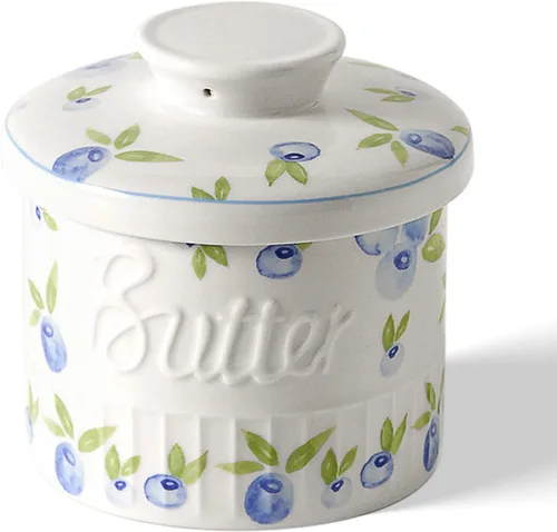 Mantequilla fresca y suave lista a la mano cuando sea necesario - ¡No más mantequilla fría del refrigerador! Esta mantequera mantiene tu mantequilla suave y untable para su uso en rollos, pan, tostadas, gofres, panqueques y más, sin tener un desorden pegajoso en un plato en algún lugar. ¡Disfruta de la mantequilla a temperatura ambiente por la mañana! FÁCIL DE USAR - Simplemente presione la mantequilla con fuerza para evitar burbujas de aire y obtenga una untable delicia al llenar la mantequera con mantequilla. Agregue agua a la mantequillera para formar un sello hermético y evitar el deterioro. Capacidad adecuada para muchas familias: el recipiente tiene capacidad para aproximadamente 1 y 1/3 barras de mantequilla blanda, depende de cómo lo presiones, técnicamente el máximo es de 1 y 1/2 barras de mantequilla blanda, es extremadamente práctico para tu familia. Obtén 2 unidades si tienes una familia grande. Porcelana de grado profesional y hermosos patrones: el recipiente para mantequilla Toptier está hecho de porcelana de grado profesional, un tipo de cerámica premium sin plomo y no tóxica, resistente a las astillas y más resistente que la cerámica, apto para lavavajillas. Está bien hecho y bellamente terminado con hermosos patrones, gato o arándano, una adición atractiva a la cocina o la mesa. CONSEJOS ÚTILES PARA EL CONSERVADOR DE MANTECAR - Añadir un poco de sal o vinagre al agua es útil para mantenerlo fresco, mientras que tampoco afecta el sabor de la mantequilla. Renueva tu agua cada 2-6 días y esto podría ser parte de tu rutina matutina. La mantequera funciona mejor con mantequilla real en lugar de margarina.