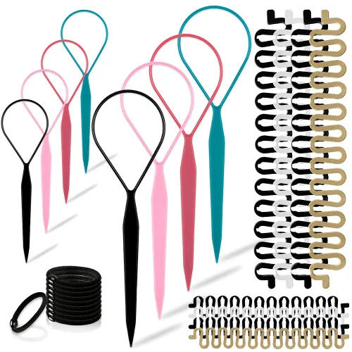 El kit de accesorios de peinado incluye 4 pares de herramientas de cola superior, 4 pares de trenzas ciempiés francesas y 10 ligas negras para el cabello La herramienta de cola Topsy está hecha de resina plástica de alta calidad, se dobla fácilmente para asegurar un estilo bonito que quieras en un minuto. Conveniente para llevar y usar Las trenzadoras ciempiés francesas están fabricadas con materiales de la más alta calidad para garantizar que duren mucho tiempo. Elástico sin metal para una sujeción sin daños y perfecto para sostener las colas de caballo firmes. Fácil y cómodo de poner y quitar Amplio uso: Tamaño pequeño, fácil de transportar y ahorro de tiempo. La herramienta de cola de granizo es adecuada para niñas con diferentes peinados, como cabello rizado, colas de caballo, trenzas, peinados de boda, fiesta o bricolaje. Los accesorios para el cabello para niñas enriquecen tu tiempo libre y te hacen más fantástica