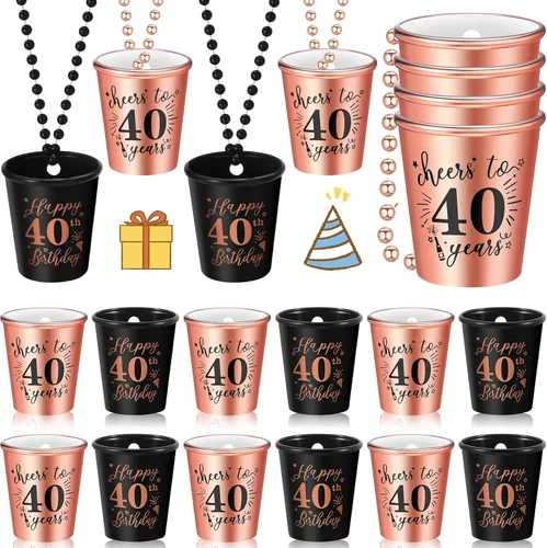 Contenido del paquete: este paquete viene con 12 vasos de chupito de plástico 40, que están disponibles en 2 colores diferentes, negro y oro rosa, cada color tiene 6 piezas, vívido y exquisito; cantidad suficiente y contenido rico para satisfacer tus necesidades de uso y reemplazo, también puedes compartirlos con amigos o familiares Diseño exquisito: el collar de chupito de cumpleaños está diseñado con el tema de celebrar 40 cumpleaños, impreso con bonitos patrones, como diamantes, palabras cálidas [saludos a 40 años] y [Feliz cumpleaños 40], lo que puede ayudar a añadir un ambiente divertido y feliz, trayendo un momento colorido Material fiable: este collar de lentes de fiesta está hecho de material plástico de calidad, seguro, fiable, resistente, no se rompe ni decolora fácilmente, ligero y portátil, que se puede aplicar durante mucho tiempo, se puede llevar alrededor de tu cuello sin una carga Tamaño adecuado: las tazas de chupito con collar miden aproximadamente 2.24 x 2.09 x 1.38 pulgadas, se adaptan a la mayoría de las personas, y no ocupan demasiado espacio, ahorrando tiempo y energía; también es adecuado para colgarlo en tu cuello, lo que te hace más atractiva y encantadora entre la multitud Amplios usos: este collar de cristal de chupito de cuentas se puede aplicar a diferentes ocasiones, como fiestas de cumpleaños, bodas, fiestas familiares, aniversarios y más, lo que te ofrece una experiencia de uso cómoda y te deja un maravilloso recuerdo
