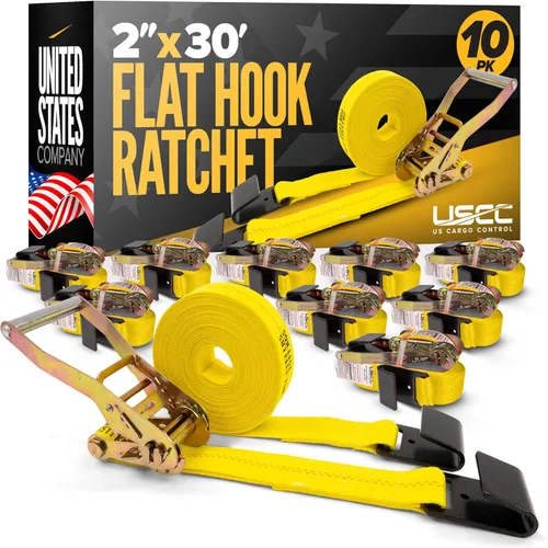 US Cargo Control Correas de trinquete de 2 pulgadas resistentes (paquete de 10), correas de trinquete de gancho plano de 2 pulgadas x 30 pies,