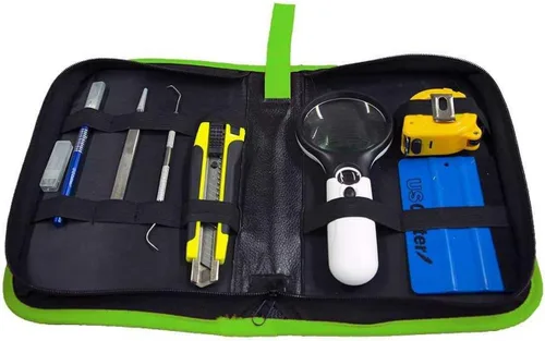 Este kit de herramientas de deshierbe de alta calidad contiene una gama de herramientas útiles para deshierbar e instalación de vinilo. El kit viene en una práctica y duradera funda con cremallera para un fácil transporte. Este kit incluye: USCutter - Cuchillo Hobby con 6 cuchillas incluidas USCutter - Herramienta de deshierbe dental Pinzas de punta USCutter para la nariz para facilitar el deshierbe USCutter - Escobilla de goma de doble cara con borde de fieltro USCutter - Lupa con luz para facilitar el deshierbe Cinta métrica Cuchillo de corte a presión Deluxe Funda de transporte (Nota: el color de la funda de transporte puede variar).