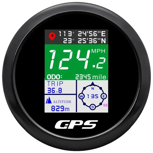 El indicador de velocímetro GPS con pantalla TFT muestra claramente el rango. Voltaje de trabajo de 9-32 V CC, indicador de velocidad con protección IP67 de resistencia al agua y al vaho. Diámetro: abre un agujero de 85 mm (3 3/8 pulgadas) y 55 mm (2 3/16 pulgadas) de profundidad para colocar el velocímetro GPS digital en él, fácil de instalar. Tres unidades pueden cambiarse: km/h; mph; nudo (redondeado a un decimal). Velómetro GPS de 85 mm se adapta para coche, tractor, camión, barco, náutica, motocicleta, etc. Tacómetro: 0-999.9; ODO: odómetro: 0-999,999 km (guarda datos cuando se apaga la electricidad); TRIP: 0-999.9 km (reinicia a cero cuando se apaga la electricidad.) ); Brújula digital: 0-359°. Después de conectar el velocímetro GPS, tarda unos 30 segundos en obtener la señal por primera vez. Se hace más rápido bajo una visión clara del cielo.