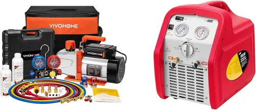 Paquete combinado: el paquete incluye una bomba de vacío de CA serie VIVOHOME VG y un juego de medidor, bomba de vacío HVAC de 3/4 HP 7.2CFM de 2 etapas y kit de manómetro de colector de 4 vías con mangueras de 5 pies para R134a R12 R22 R502 R410a Auto HVAC Systems Uso comercial, y VIVOHOME 110-120V AC 60Hz 3/4HP Refrigerador portátil de un solo cilindro Máquina de recuperación de hormigas, rojo Bomba de vacío de alta calidad: esta bomba de vacío de doble etapa de la serie VIVOHOME VG ofrece un rendimiento excepcional con un motor de cobre puro de 3/4 HP; funciona a 3456 RPM, logra un flujo rápido de 7.2 CFM (204 L/min), asegurando una eliminación eficiente del aire durante el mantenimiento de HVAC y refrigeración; la bomba alcanza un vacío final de 15 micras y una presión parcial tan baja como 0.2 piezas a, ofreciendo una fuerte succión para la evacuación profunda Calibre preciso y mangueras duraderas: el medidor de colector de 4 vías de alta precisión proporciona lecturas precisas y confiables para sistemas HVAC y refrigeración; la carcasa de goma absorbe los golpes para evitar daños internos, mientras que un gancho colgante integrado libera tus manos durante el funcionamiento; el tornillo de calibración ofrece un ajuste fácil para un diagnóstico preciso; Las mangueras codificadas por colores - rojo para alta presión, azul para baja presión, amarillo para refrigeración. hormiga, y negro para vacío - hacer que la configuración sea muy fácil; Clasificado para 800 PSI trabajando a RECUPERACIÓN DE ALTA EFICIENCIA: Este compresor tiene una velocidad máxima de recuperación de 3/4 HP que recupera rápidamente los refrigerantes líquidos y vapores; garantizado para ofrecer un rendimiento de recuperación excepcional Secador de filtro: viene con un filtro secador para eliminar la humedad y sustancias ácidas en el aire; el filtro es reemplazable