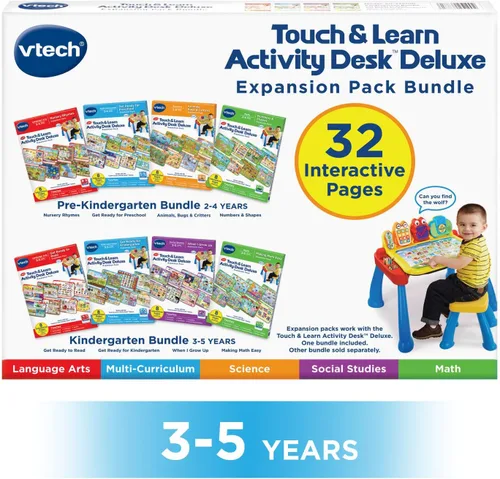 Este exclusivo paquete de expansión 4 en 1 para jardín de infantes viene con todos los 4 paquetes de expansión destinados para niños de 3 a 5 años: Prepárate para Leer, Haciendo las Matemáticas Fáciles, Prepárate para el Jardín de Infantes y Cuando Yo Crezca. Cada paquete de expansión incluye un cartucho y cuatro coloridas páginas de actividades de doble cara, que se pueden usar solo con el escritorio de actividades VTech Touch and Learn Deluxe (se vende por separado). Las tarjetas duraderas se limpian fácilmente y no se rompen. Incompatible con VTech Touch and Learn Activity Desk Paquete de expansión - Prepárate para leer: Los niños pueden practicar habilidades de lectura temprana mientras exploran las coloridas ilustraciones, aprenden vocabulario nuevo y escuchan las historias de Jack and the Beanstalk y Caperucita Roja. Aprende a combinar letras mayúsculas y minúsculas y el orden de las trazas de las letras Paquete de expansión - Haciendo las matemáticas fáciles: Explora las coloridas ilustraciones mientras aprendes a contar, contar con saltos, sumas simples, medidas y sentido espacial. La exploración libre y guiada permite a los niños aprender matemáticas de la manera que mejor les convenga Paquete de expansión - Prepárate para el jardín de infantes: explora las coloridas ilustraciones mientras aprendes números, opuestos, plantas y clima y escucha la historia de la tortuga y la liebre. Este plan de estudios completo puede ayudar a preparar a los niños para el jardín de infantes al presentarles los conceptos básicos del jardín de infantes Paquete de expansión - Cuando crezca: Explora las coloridas ilustraciones mientras aprendes ocho carreras diferentes, incluyendo médico, veterinario, piloto, científico, artista, chef y bombero. Descubre una carrera diferente en cada página mientras aprendes vocabulario específico para ese trabajo