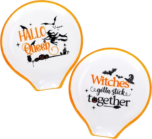 El paquete incluye: 2 soportes para cucharas de Halloween en el paquete, adecuados para repuesto y reemplazo, satisfaciendo tus diferentes necesidades navideñas. Diseño temático de Halloween: impreso con patrones de bruja, murciélago y calabaza y palabras relacionadas, tomando blanco, negro y naranja como colores principales, a juego con el tema de Halloween, único y delicado, nuestras cucharas crearán un fuerte ambiente festivo para tu hogar y fiesta. Tamaño adecuado: cada soporte para cuchara de café mide aproximadamente 3.5 x 3.9 pulgadas, adecuado para guardar cucharas y otros objetos pequeños. Material duradero: hecho de material de cerámica de calidad, nuestro soporte para cucharas no se decolora fácilmente y se mantendrá en forma durante mucho tiempo. Amplia aplicación: un buen ayudante para mejorar tu calidad de vida en casa, accesorios perfectos para el hogar y fiestas, un maravilloso regalo para el próximo Halloween.