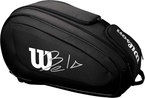 Wilson Bela DNA Super Tour - Bolsa de pádel con capacidad para hasta 6 paletas, color negro Capacidad de raqueta: hasta 6 2 compartimentos principales con forro Thermoguard; 1 compartimento para zapatos 1 bolsillo para accesorios con forro polar Dimensiones: 23,5 x 12 x 12" / 60 x 31 x 31 cm; Materiales: 100% poliéster con revestimiento de TPU